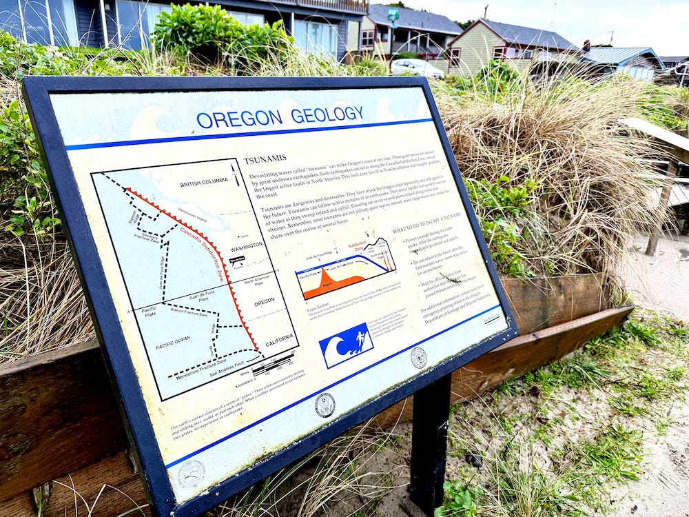 This sign is tucked away near the foot of the main street in Manzanita. I saw it shortly after I moved to the coast. I haven’t stopped thinking about the Cascadia Subduction Zone since.