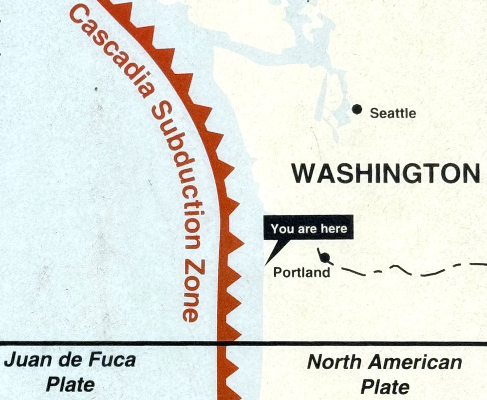 “You are here.” Such an understated observation, in contrast to the big red saw that is poised to chew up the Pacific Northwest. It looks like a cold front, but it’s not blue. The power of graphic design. After seeing this, I did more research. I learned what subduction is. I learned that this zone, where two tectonic plates are pushing up against each other, is less than 100 miles off the coast, and the resulting tsunami would reach us in minutes. This sign made something clear that I had buried in my subconscious: I’ve chosen to live in a location that could be wiped out at any moment.